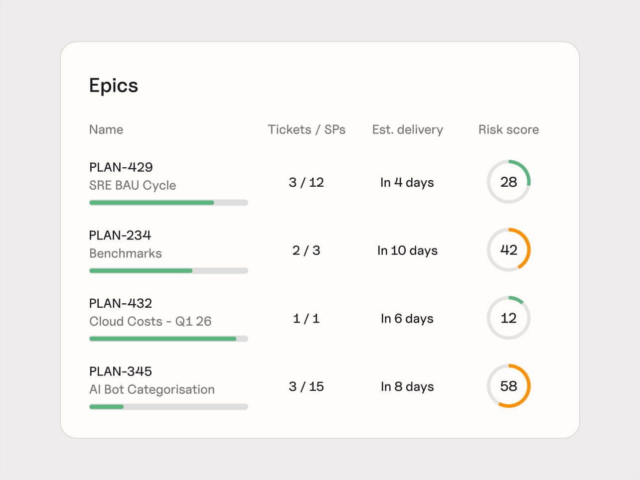 See every epic in one place, with live progress, scope and status. Group them into the views that matter to you like quarterly deliverables, product areas, team initiatives, and share a single source of truth across your organisation.