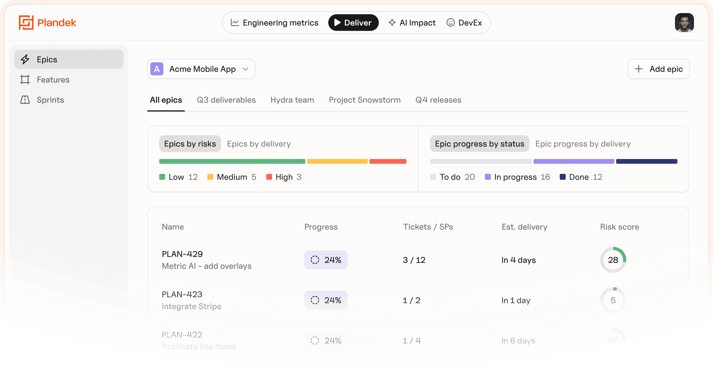 Jira and ADO show static delivery dates, Plandek shows dynamic dates based on how your work is actually moving. The Plandek epic risk score combines velocity, PR activity and review cycles into a single signal, so you can escalate, rescope or reprioritise before the date slips, not after.