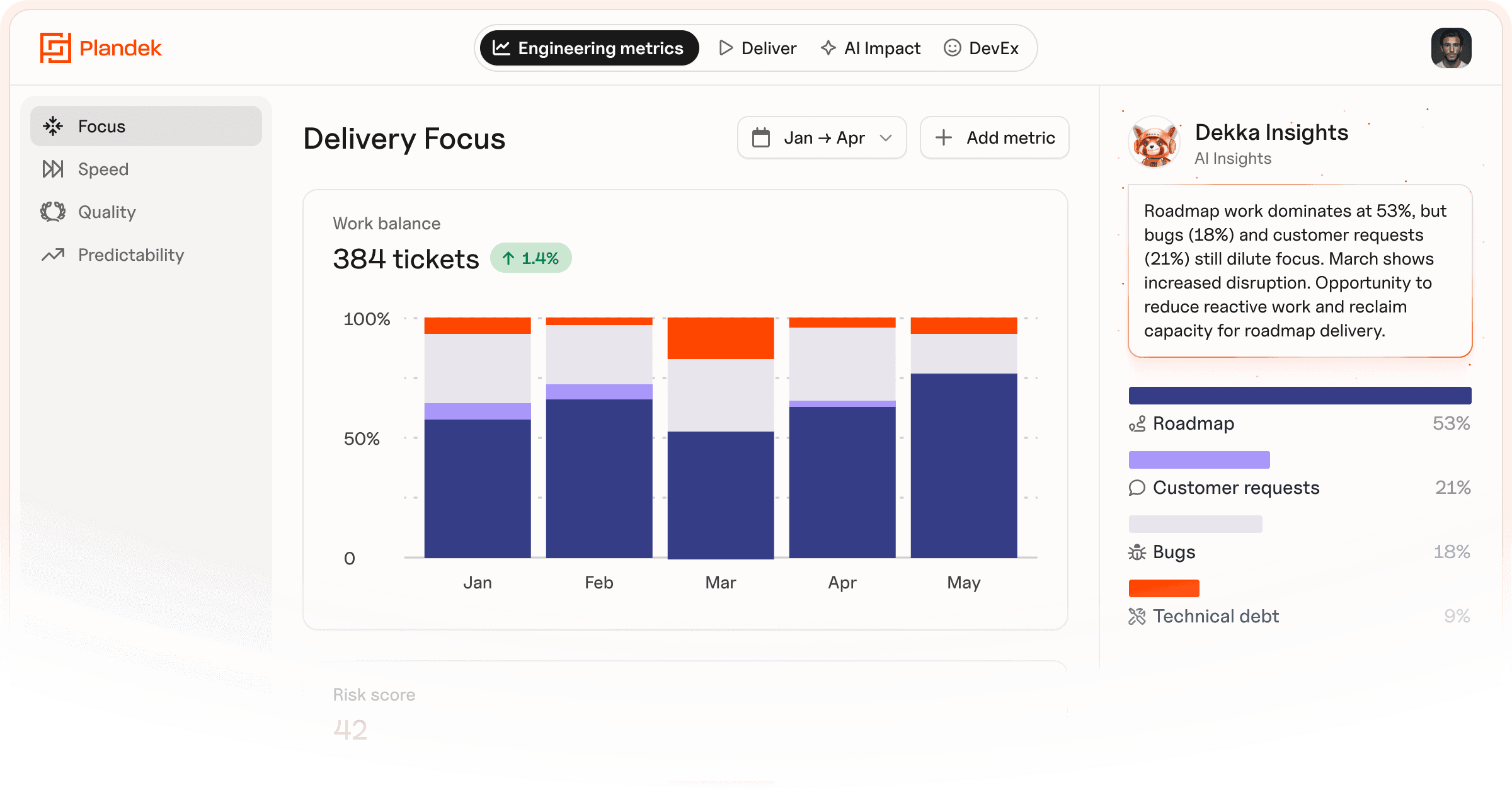 Plandek connects to tools like Jira, Git, and Jenkins to instantly see where engineering efforts are actually going. No manual dashboards or data stitching required - just clear, actionable insight.