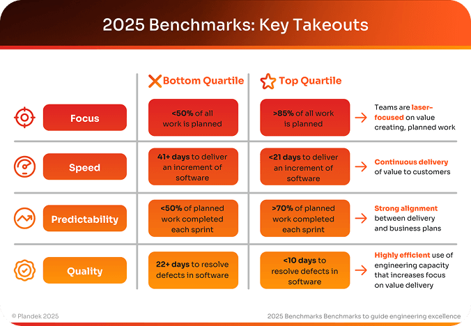 Content: The 2025 Software Delivery Benchmark Report is a comprehensive, data-driven analysis of engineering performance across the software industry. Developed by Plandek, this report is based on extensive data from high-performing Agile and DevOps teams, providing empirical insights into the key factors that drive success in modern software development.
